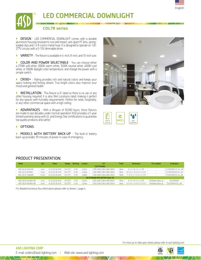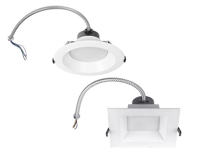 DESIGN. LED COMMERCIAL DOWNLIGHT comes with a durable aluminum housing resistant to rust and impact, anti-glare PC lens, spring-loaded clips and 1.6 ft cord in metal hose. It is designed to operate on 120-277V circuits with a 0-10V dimmable driver.
