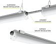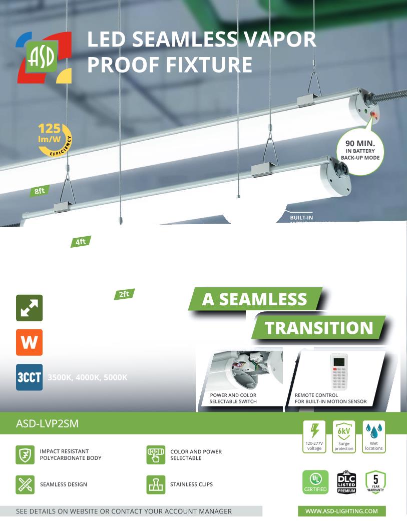 DESIGN. LED SEAMLESS VAPOR PROOF FIXTURE has a waterproof polycarbonate body with a frosted lens, making this fixture impact resistant. The design of the fixture allows for daisy chaining multiple fixtures together. It comes with a 4ft cord to make the installation process easier. It is designed to operate on 120-277V circuits with a 0-10V dimmable driver and includes built-in 6KV surge protection for enhanced electrical safety.