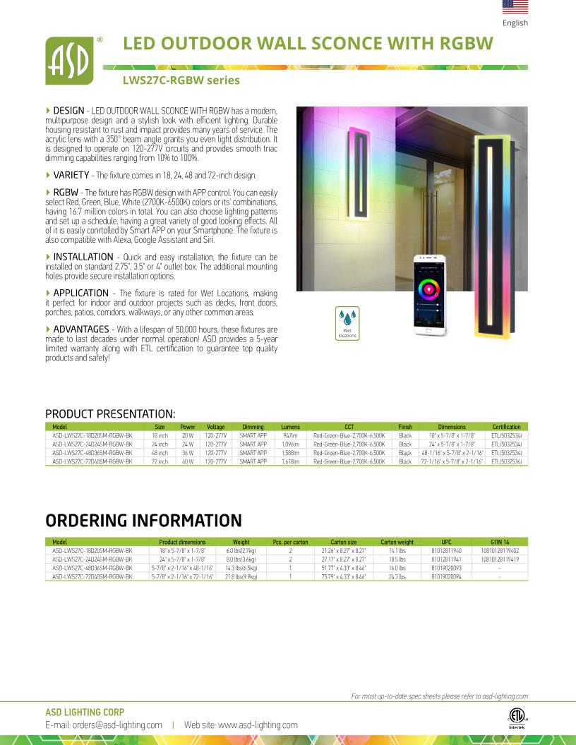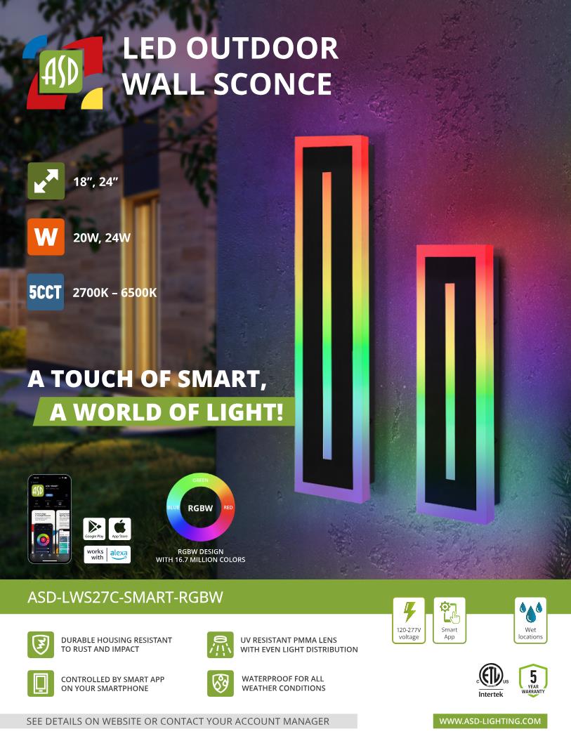 DESIGN. LED OUTDOOR WALL SCONCE WITH RGBW has a modern, multipurpose design and a stylish look with efficient lighting. Durable housing resistant to rust and impact provides many years of service. The acrylic lens with a 350° beam angle grants you even light distribution. It is designed to operate on 120-277V circuits and provides smooth triac dimming capabilities ranging from 10% to 100%.