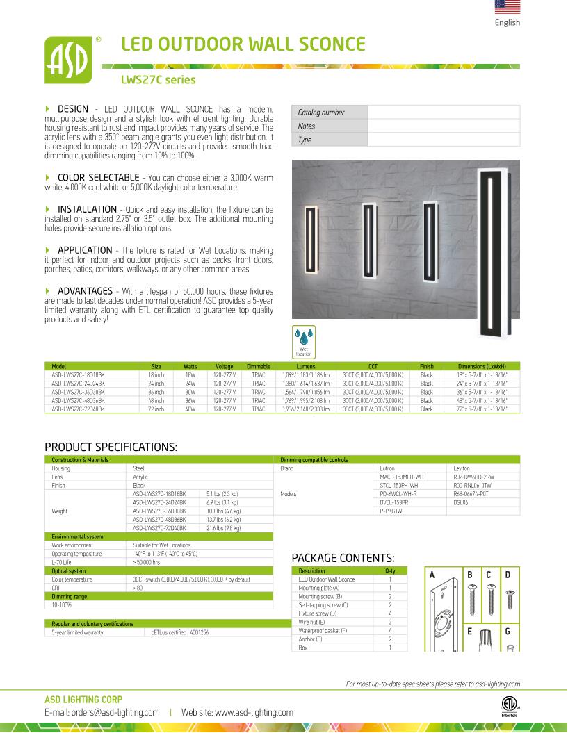 DESIGN. LED OUTDOOR WALL SCONCE has a modern, multipurpose design and a stylish look with efficient lighting. Durable housing resistant to rust and impact provides many years of service. The acrylic lens with a 350° beam angle grants you even light distribution. It is designed to operate on 120-277V circuits and provides smooth triac dimming capabilities ranging from 10% to 100%.