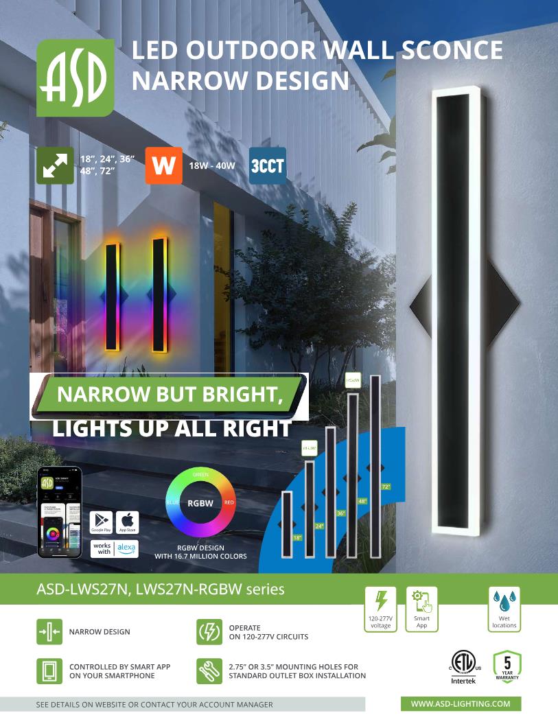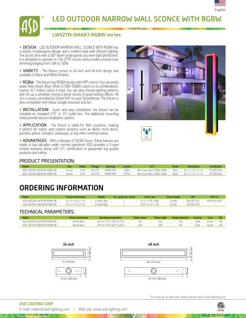 DESIGN. LED OUTDOOR NARROW WALL SCONCE WITH RGBW has a stylish, multipurpose design and a modern look with efficient lighting. The acrylic lens with a 350° beam angle grants you even light distribution. It is designed to operate on 120-277V circuits and provides smooth triac dimming ranging from 10% to 100%.
