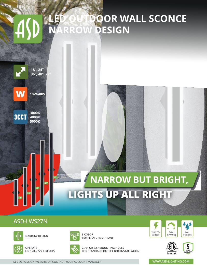 DESIGN. LED OUTDOOR NARROW WALL SCONCE has a stylish, multipurpose design and a modern look with efficient lighting. Durable housing resistant to rust and impact provides many years of service. The acrylic lens with a 350° beam angle grants you even light distribution. It is designed to operate on 120-277V circuits and provides smooth triac dimming ranging from 10% to 100%.