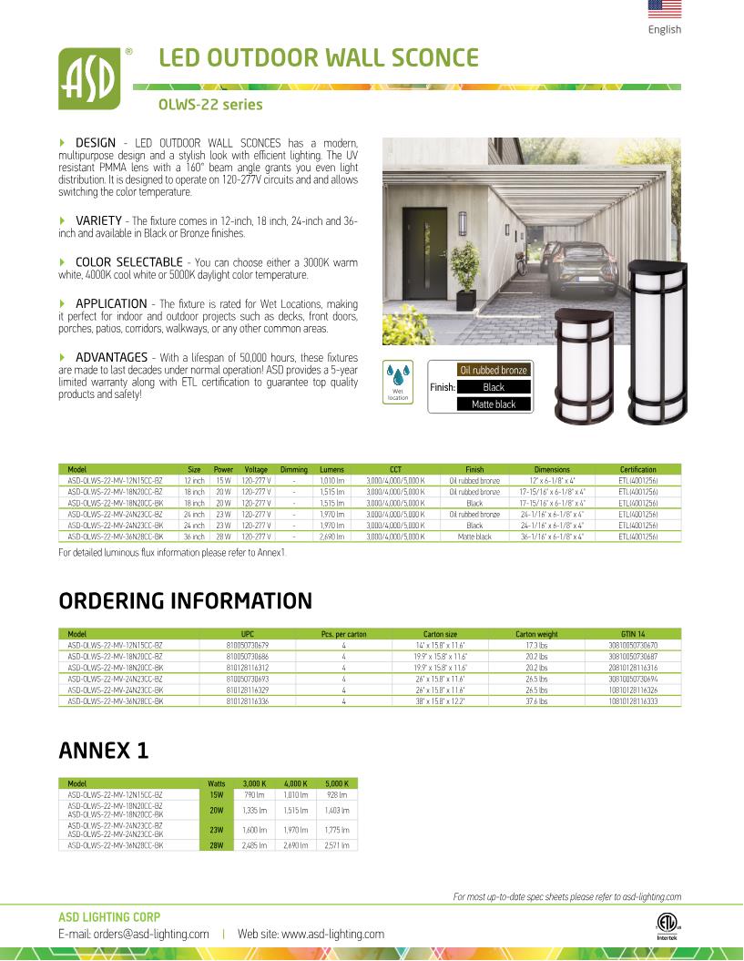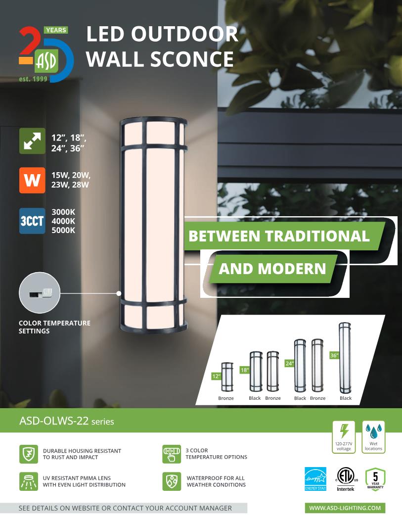 DESIGN. LED OUTDOOR WALL SCONCES has a modern, multipurpose design and a stylish look with efficient lighting. The UV resistant PMMA lens with a 160° beam angle grants you even light distribution. It is designed to operate on 120-277V circuits and and allows switching the color temperature.