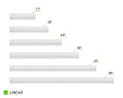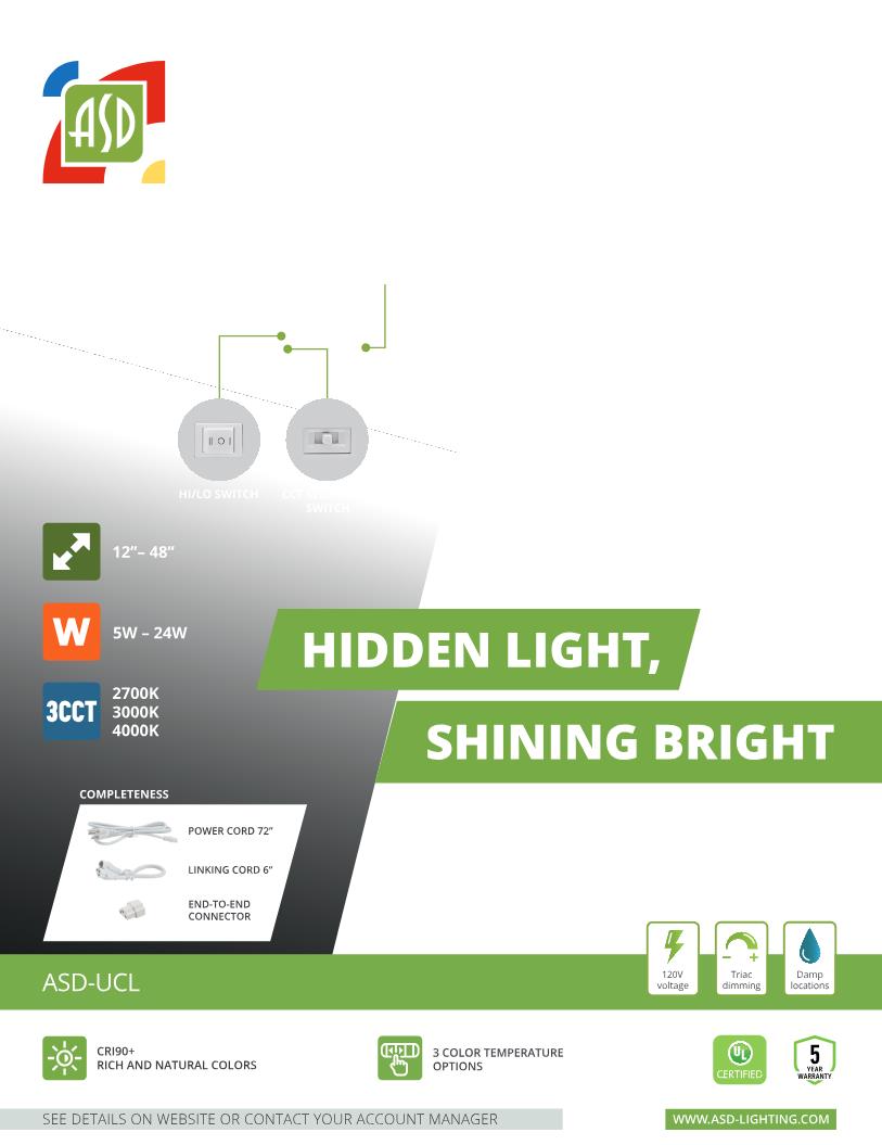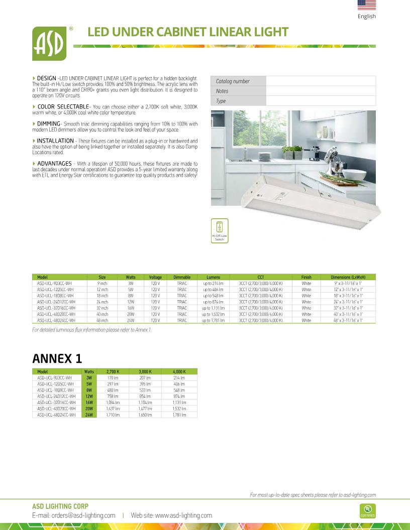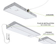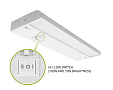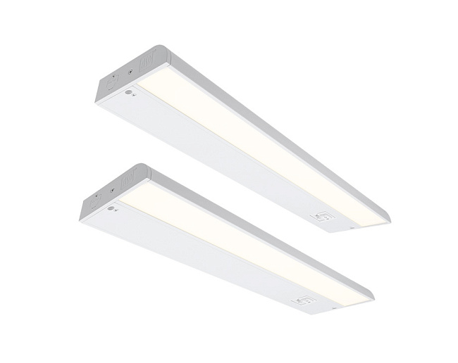 DESIGN. LED UNDER CABINET LINEAR LIGHT is perfect for a hidden backlight. The fixture comes in 12-inch, 18-inch, 24-inch, 32-inch, 40-inch and 48-inch with voltage 120V and available in White finish. The built-in Hi/Low switch provides 100% and 50% brightness. The acrylic lens with a 110° beam angle and CRI90+ grants you even light distribution.