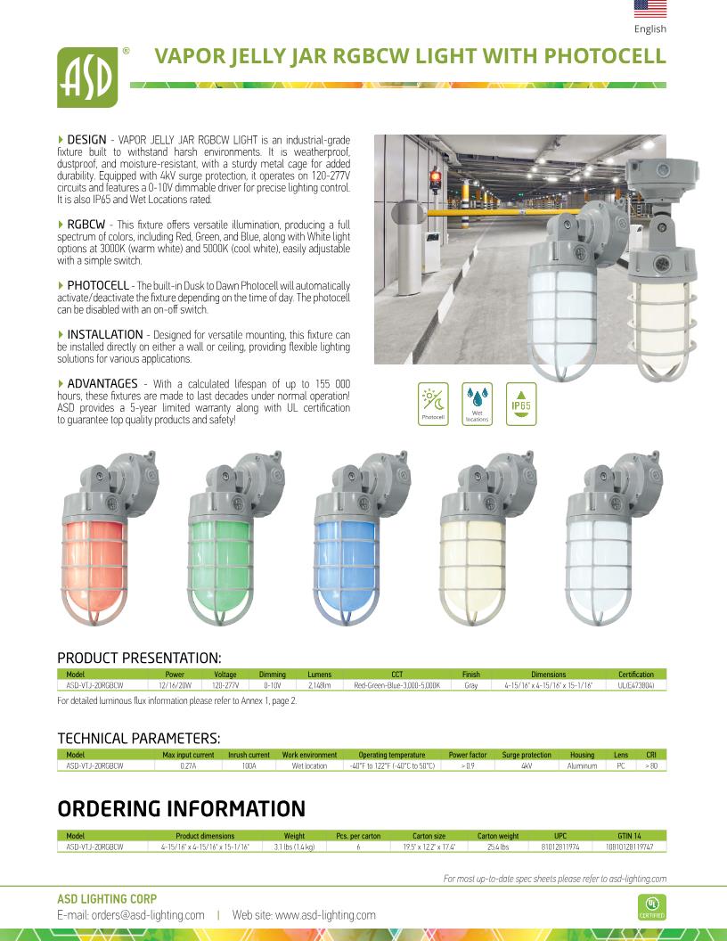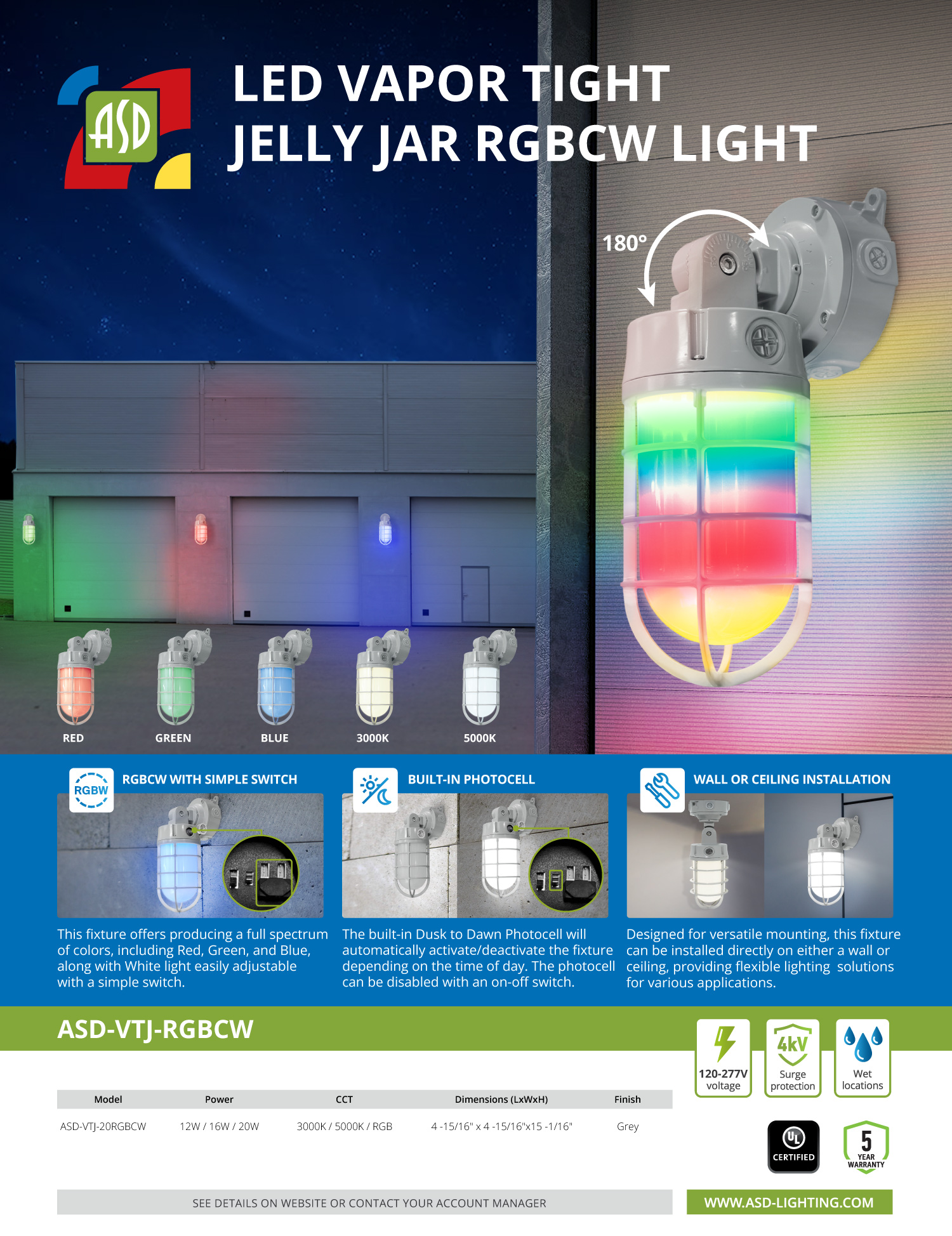 DESIGN. VAPOR JELLY JAR RGBCW LIGHT is an industrial-grade fixture built to withstand harsh environments. It is weatherproof, dustproof, and moisture-resistant, with a sturdy metal cage for added durability. Equipped with 4kV surge protection, it operates on 120-277V circuits and features a 0-10V dimmable driver for precise lighting control. It is also IP65 and Wet Locations rated.