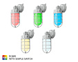 RGBCW. This fixture offers versatile illumination, producing a full spectrum of colors, including Red, Green, and Blue, along with White light options at 3000K (warm white) and 5000K (cool white), easily adjustable with a simple switch.