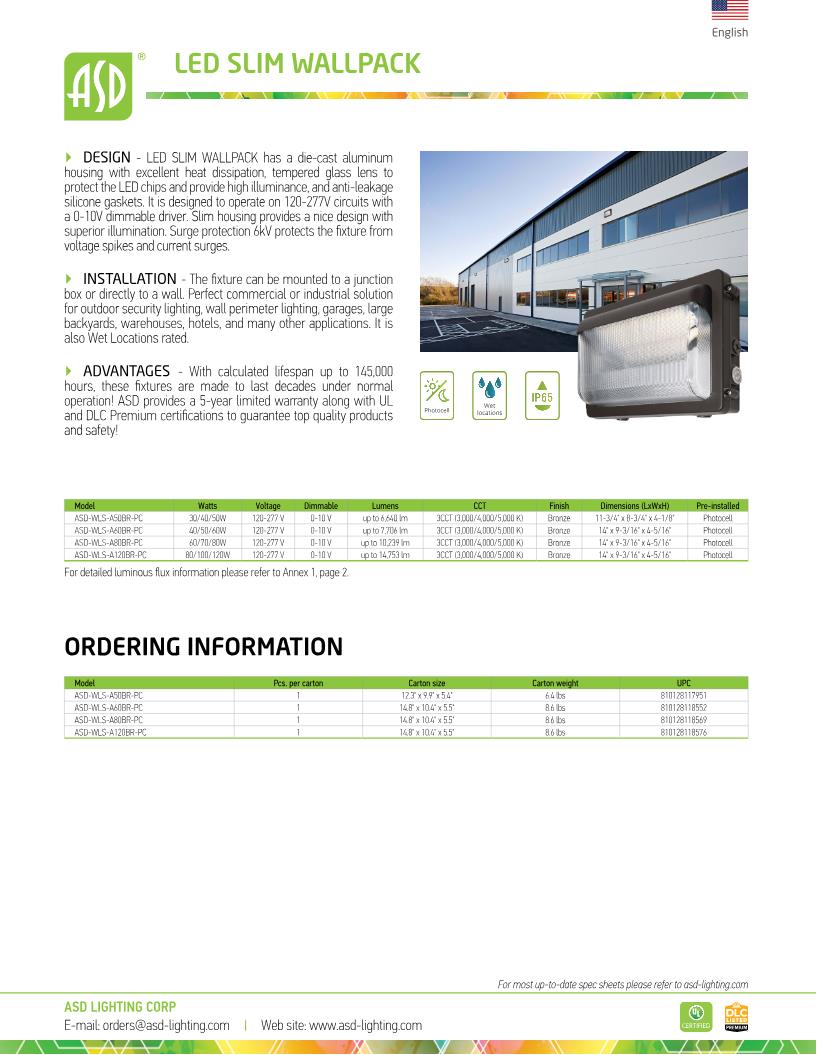 DESIGN. LED SLIM WALLPACK has a die-cast aluminum housing with excellent heat dissipation, tempered glass lens to protect the LED chips and provide high illuminance, and anti-leakage silicone gaskets. It is designed to operate on 120-277V circuits with a 0-10V dimmable driver.
